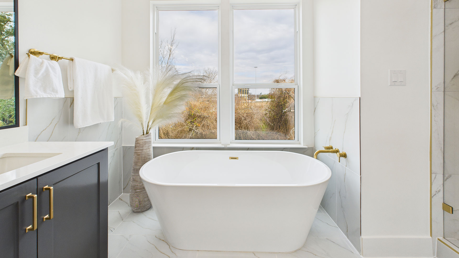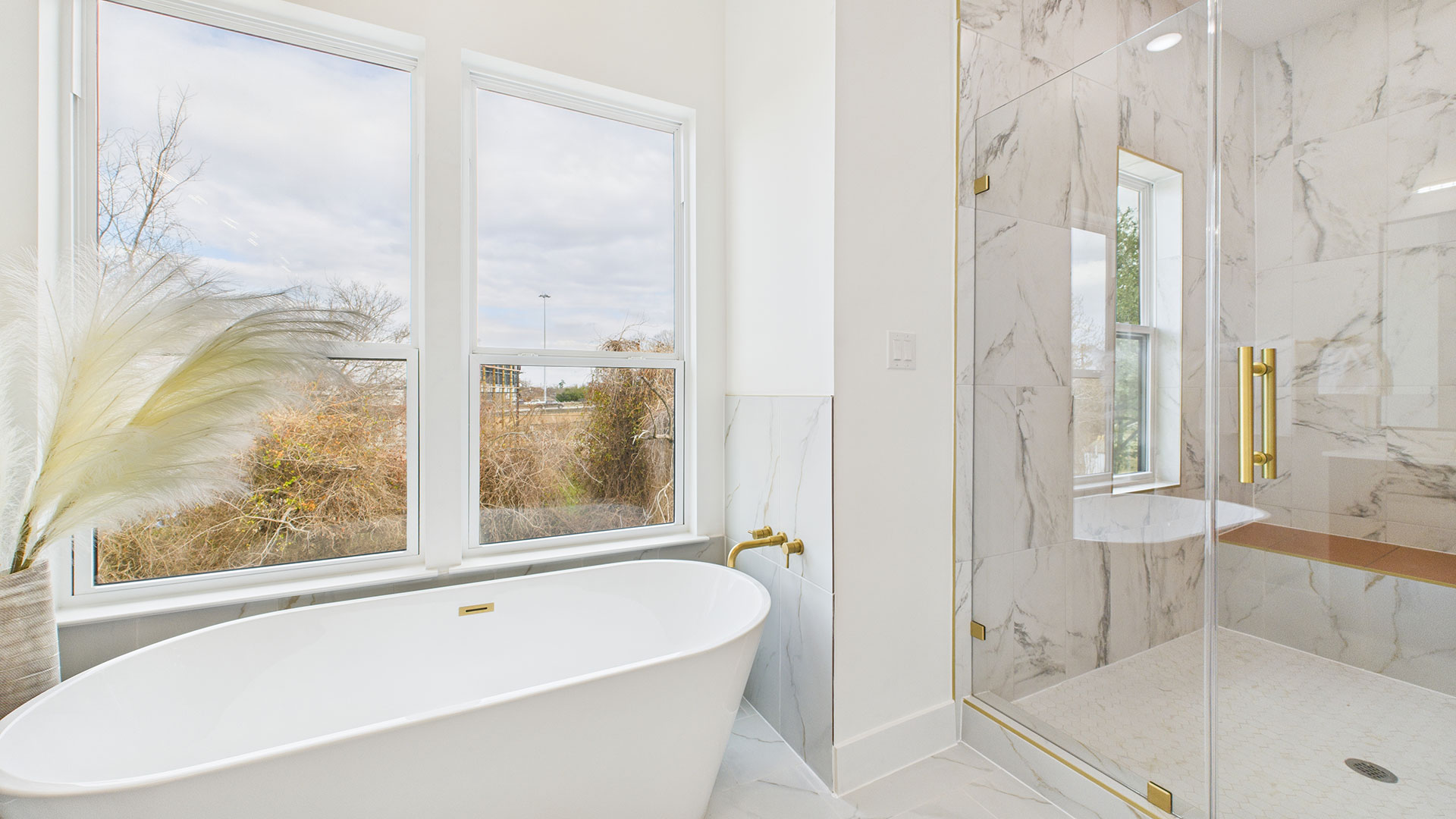 Spa-inspired primary bath featuring a six-foot soaking tub and double rain showerheads with handhelds