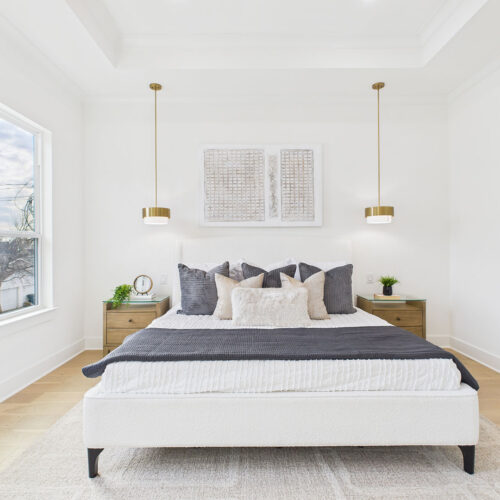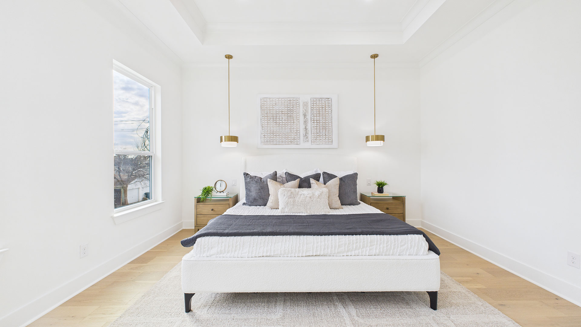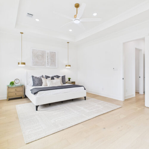 Elegant second-floor primary suite with coffered ceilings
